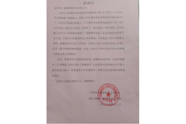 032019.04鄭州高鐵南站項(xiàng)目總包方向公司 發(fā)來表揚(yáng)信