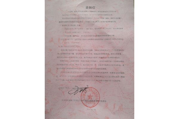 102019.01北京國(guó)電德勝工程項(xiàng)目管理有限公司錫林熱 電項(xiàng)目監(jiān)理部給鋼構(gòu)公司發(fā)來(lái)表?yè)P(yáng)信